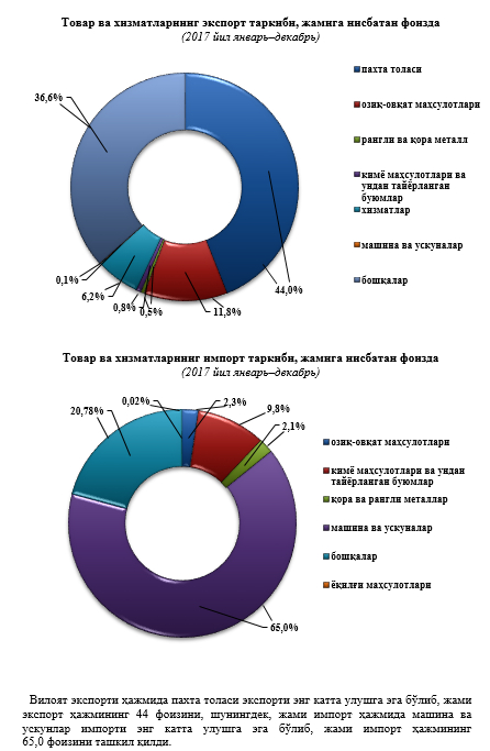 2017-йил 4-квартал статистик ва таҳлилий ахборотлар (2.4мб, PDF)2017 йилнинг январь-декабрь ташқи савдо айланмаси 252,9 млн. АҚШ долларини, жумладан 120,2 млн. АҚШ долларини, экспорт операциялари, 132,7 млн. АҚШ долларини импорт операциялари ташкил этди.Ташқи савдо айланмасининг сальдоси -12,5 млн. АҚШ долларини ташкил қилди.