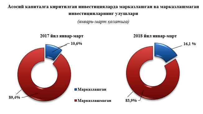 Вилоятда асосий капиталга киритилган инвестицияларда марказлашган ва марказлашмаган инвестицияларнинг улушлари 2018 йил январь-март ойларида мос равишда 16,1 фоиз ва 83,9 фоизларни ташкил қилиб, ушбу кўрсаткичларнинг улушлари ўтган йилнинг шу даврида 10,6 фоиз ва 89,4 фоизларни ташкил қилди.