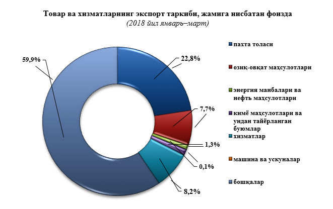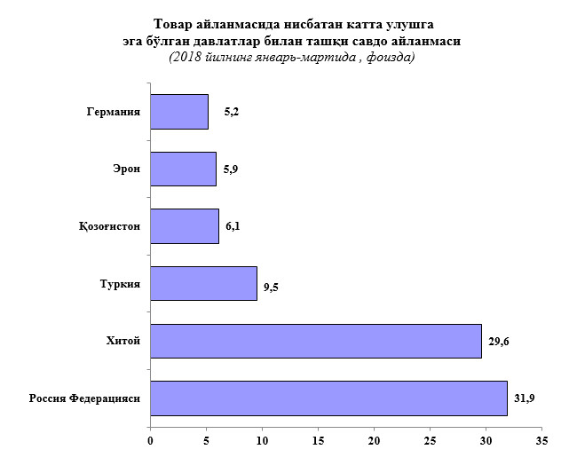 2018-йил 1-квартал статистик ва таҳлилий ахборотлар (2.2мб, PDF)2018 йилнинг январь-март ташқи савдо айланмаси 53,5 млн. АҚШ долларини, жумладан 22,4 млн. АҚШ долларини, экспорт операциялари, 31,1 млн. АҚШ долларини импорт операциялари ташкил этди.Ташқи савдо айланмасининг сальдоси -8,7 млн. АҚШ долларини ташкил қилди.