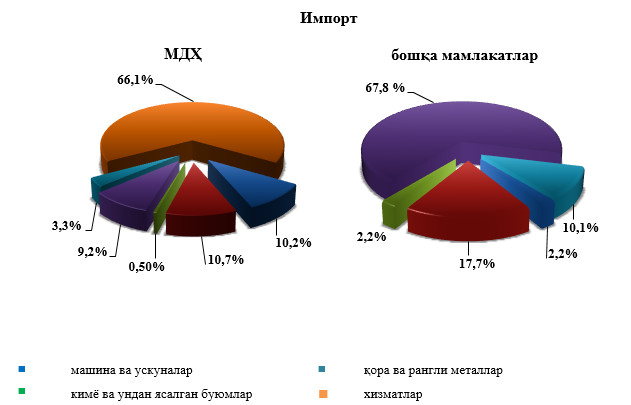 59,9 фоизини, шунингдек, жами импорт ҳажмида машина ва ускунлар импорти энг катта улушга эга бўлиб, жами импорт ҳажмининг 46,0 фоизини ташкил қилди.