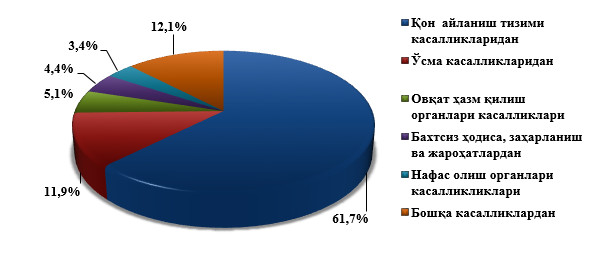 Ўлганларнинг умумий сонидан 61,7 фоизи қон айланиш тизими касалликларидан, 11,9 фоизи – ўсма касалликларидан, 4,4 фоизи – бахтсиз ҳодиса, заҳарланиш ва жароҳатлардан, 5,1 фоизи – овқат ҳазм қилиш органлари касалликларидан, 3,4 фоизи – нафас олиш органлари касалликликларидан ва 12,1 фоизи бошқа касалликлардан вафот этган.