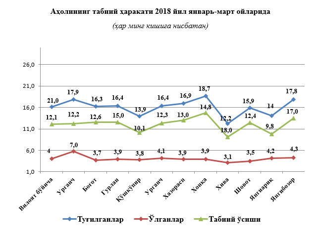 Туғилиш. 2018 йилнинг январь-март ойларида туғилганлар сони 7158 кишини ташкил қилди ва 2017 йилнинг шу даврига (7419 киши) нисбатан 261 тага камайди. Туғилиш коэффициенти мос равишда 16,1 промиллени ташкил қилди ва 2017 йилнинг шу даврига (16,9 промилле) нисбатан 0,8 промиллега камайди.
