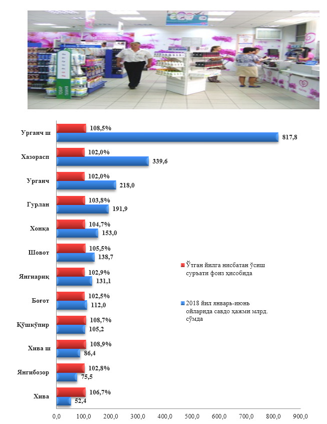 Чакана савдо (умумовқатланиш фаолиятини қўшган ҳолда) аҳоли жон бошига нисбатан ҳисоблаганда 1337,8 минг сўмни ташкил этиб, ўтган йилга нисбатан 103,7 фоиз булиб (2017 йил январь-июнь ойларида 1054,8 минг сўмни ташкил этган).