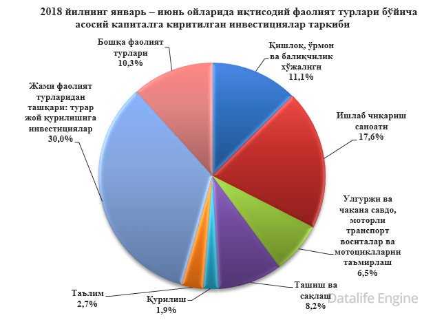 2018 йилнинг январь – июнь ойларида 81,5 млрд.сўм (доллар эквивалентида 10,1 млн.долл) ёки ўтган шу даврига нисбатан 113,9 фоиз асосий капиталга хорижий инвестиция ва кредитлар ўзлаштирилди.