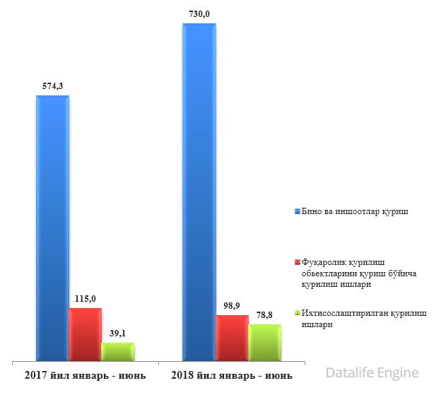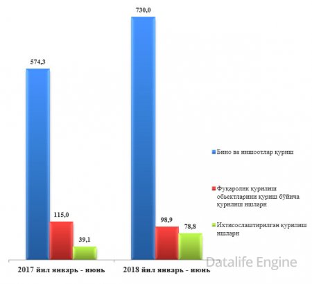 2018 йил январь-июнь ойларида 907,7 млрд. сўмлик қурилиш ишлари бажарилиб, ўтган йилнинг шу даврига нисбатан 104,0 фоизни ташкил этди.