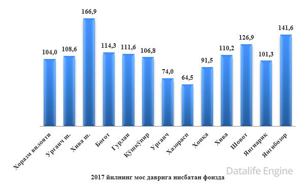 Шунингдек, 2017 йилнинг шу даврига нисбатан камайиш кузатилган туманлар қуйидагилар: Урганч тумани 74,0 фоиз, Хазорасп тумани 64,5 фоиз ва Хонқа тумани 91,5 фоиз.