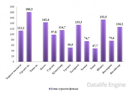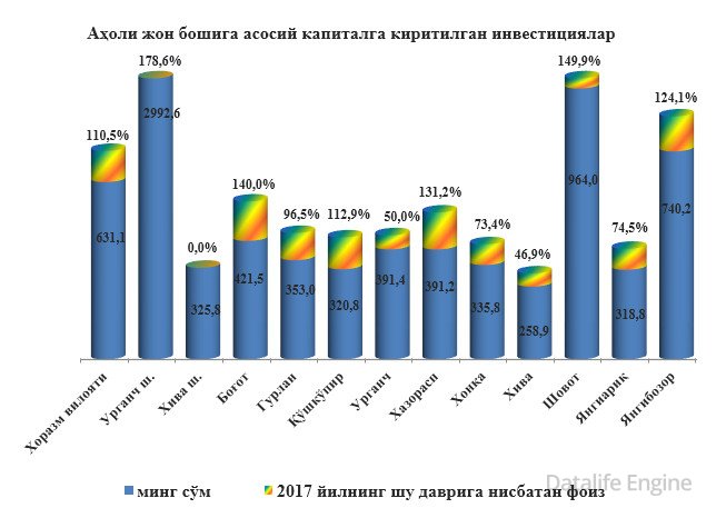 Айрим туманларда асосий капиталга киритилган инвестицияларнинг юқори ўсиш суръатлари кузатилди. Жумладан, ўтган йилнинг шу даврига нисбатан Урганч шаҳри 180,3 фоиз, Шовот тумани 152,5 ва Боғот тумани 142,4 фоиз ўсиш кузатилди.