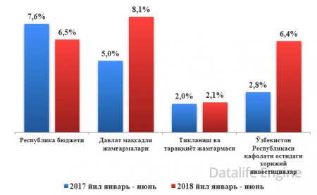 2017 йилнинг шу даври билан солиштирганда Ўзбекистон Республикаси кафолати остидаги хорижий инвестициялар улуши 3,6 фоиз пунктга ўсган, мос равишда Давлат мақсадли жамғармаси улуши 3,1 фоиз пунктга кўпайган бўлса, Республика бюджети маблағларининг улуши 1,1 фоизли пунктга камайди.