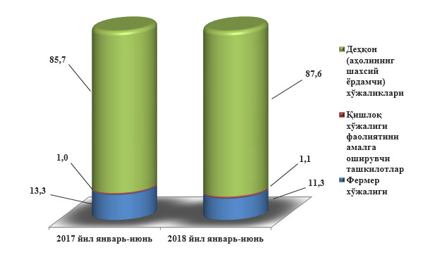 (2017 йил январь-июнида – 85,7 фоиз), фермер хўжаликлари томонидан қишлоқ хўжалиги маҳсулотларининг 11,3 фоизи ишлаб чиқарилган (2017 йил январь-июнида 13,3 фоиз), шунингдек,қишлоқ хўжалиги фаолиятини амалга оширувчи корхоналар томонидан жами қишлоқ хўжалиги маҳсулотларининг 1,1 фоизи ишлаб чиқилган. 2018 йилнинг январь-июнида ҳудудлар кесимида қишлоқ, ўрмон ва балиқ хўжалиги маҳсулотлари (хизматлар)нинг ҳажми