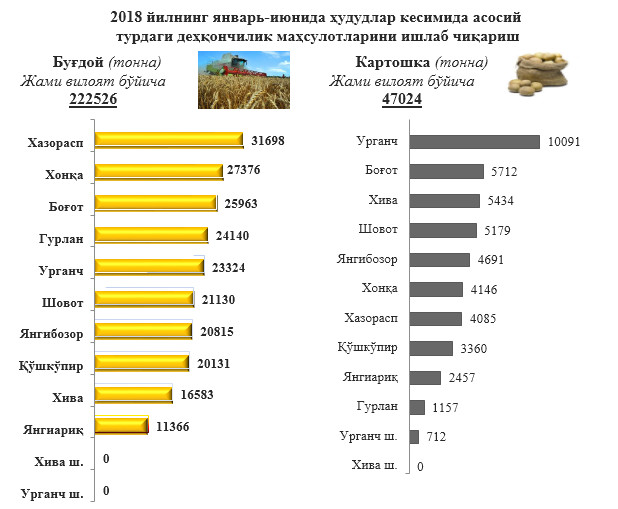 2018-йил 2-квартал статистик ва таҳлилий ахборотлар (5.2мб, PDF)2018 йилнинг январь-июнида ишлаб чиқарилган (кўрсатилган хизматлар) умумий ҳажми 2018,1 млрд. сўмни ёки 2017 йилнинг шу даврига нисбатан 102,7 фоизни шу жумладан ялпи деҳқончилик маҳсулотлари 709,8 млрд. сўмни