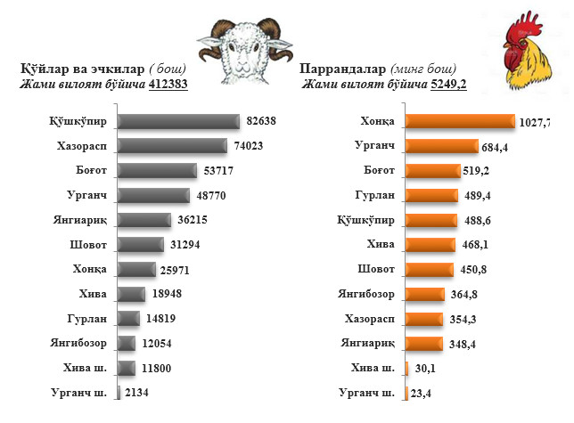 849,6 минг бошни ташкил қилиб ўтган йилнинг шу даврига нисбатан 100,2 фоизга кўпайган бўлса, шу жумладан сигирлар сони 330,0 минг бошни ташкил қилиб 99,5 фоизга камайган. Қўй ва эчкилар сони 412,4 минг бошни ташкил этиб, 103,0 фоизга ошган бўлса, отлар сони 5,3 минг бошни ташкил этиб, 99,6 фоизга, паррандалар сони 5249,2 минг бошни ташкил этиб 98,8 фоизга камайган.