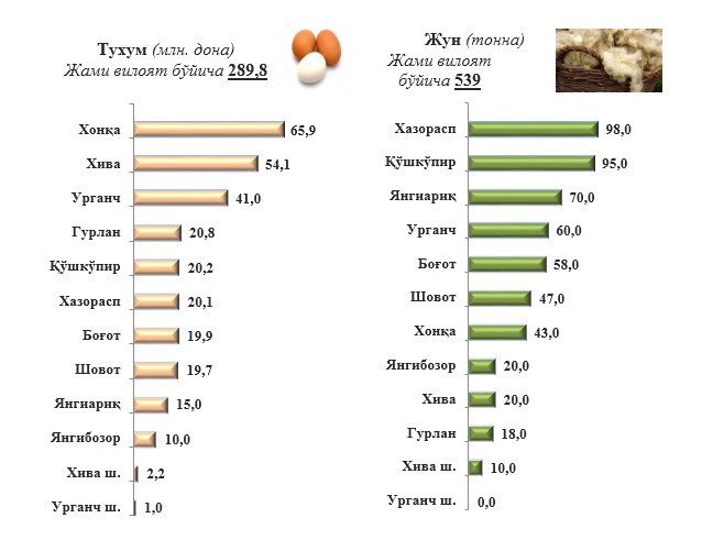 Барча ҳудудларда чорвачилик маҳсулотлари (гўшт, сут, тухум) ишлаб чиқаришнинг ўсиши асосан деҳқон ва фермер хўжаликлари ҳисобига бўлиб, гўшт ишлаб чиқариш умумий ҳажмида уларнинг улуши 99,4 фоизни, сут ишлаб чиқаришда 99,7 фоизни, тухум ишлаб чиқаришда 71,7 фоизни ташкил этди.