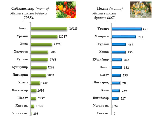 (104,1 фоизга кўп) йиғиб олинди, 4,5 минг тонна полиз экинлари (112,2 фоизга кўп),