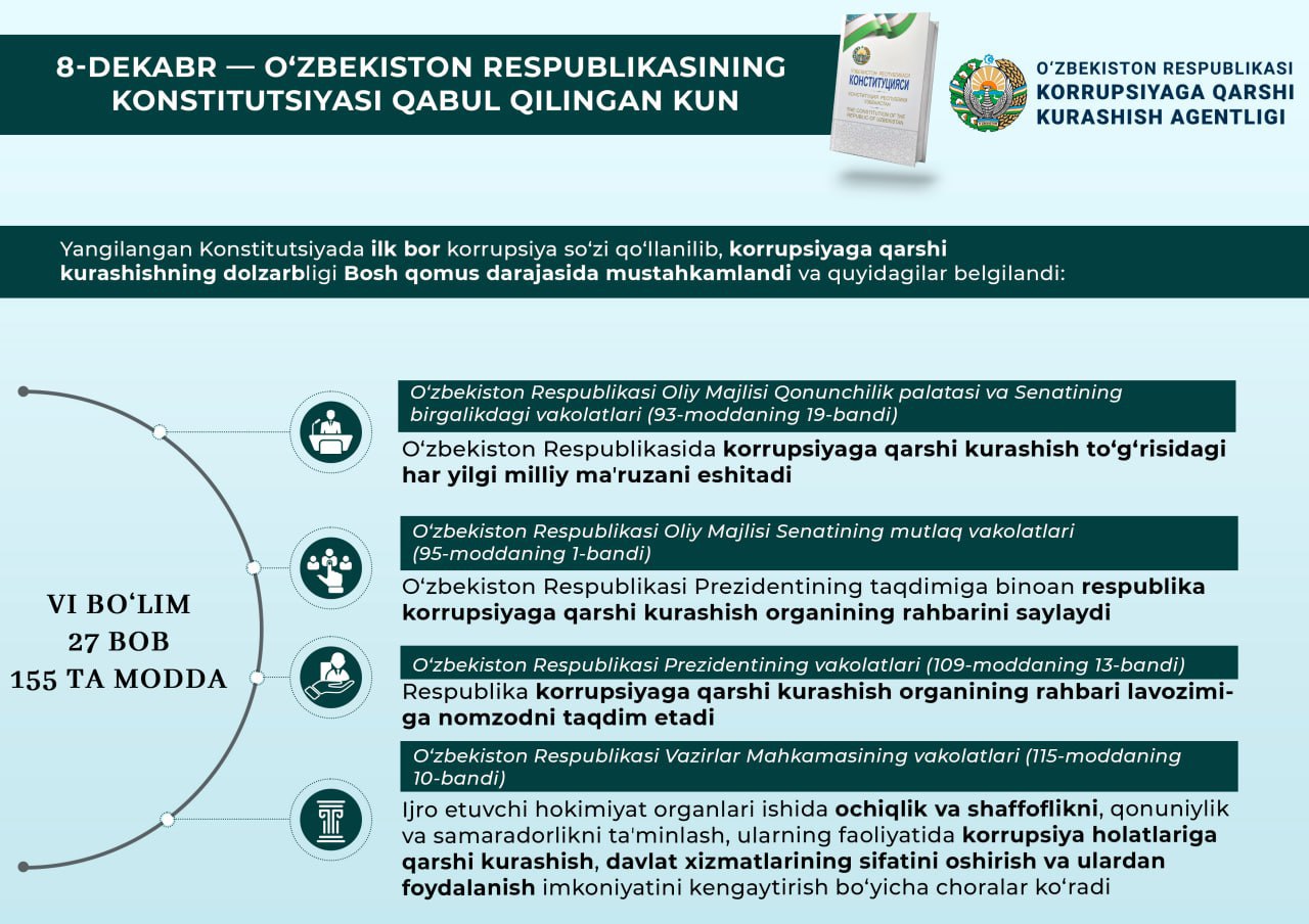O'zbekiston tarixida ilk bor korrupsiya so‘zi Konstitutsiyada qo‘llanilib, korrupsiyaga qarshi kurashish vazifasi Bosh qomus darajasida mustahkamlandi.
