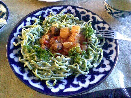 Oldin xamir tayyorlanadi. Buning uchun shivit yaxshilab yuvilib, go‘shtmaydalagichdan chiqariladi va ustidan bir piyola suv quyiladi. Yoki shivitni mayda qilib to‘g‘rab, ustiga suv quyib blendr yordamida aralashtirish ham mumkin. Tayyor aralashmaga tuxum, tuz va un solinib xamir qilinadi. Xamir yashil va plastilinga o‘xshash shaklda bo‘ladi. 20-30 daqiqa tindirib qo‘yilgach, lag‘mon qalinligida yoyiladi.Yoyilgan xamir rulet qilinib, 1 sm kattalikda kesiladi va qaynab turgan sho‘r suvda 2-3 daqiqa qaynatib olinib, ustidan sovuq suv o‘tiriladi. Alohida idishga qatiq, smetana va ozroq tuz solib yaxshilab aralashtiramiz. Xosil bo‘lgan sous ustiga pishib chiqqan “yashil lag‘mon”ni solib qoramiz.