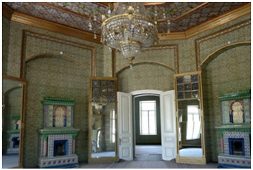 Qasr qurilishida Sharqona va Evropacha uslub aralashgan. Barcha xonalar bir-biridan tubdan farq qiladi. Rus uslubidagi kamin, katta keng oynalar va sharqona uslubda geometrik naqshlar va gullar bezalgan turfa rang shiftlar. Qasrning balanda eshik va oynalari Nemis duradgorlari tomonidan yasalgan.